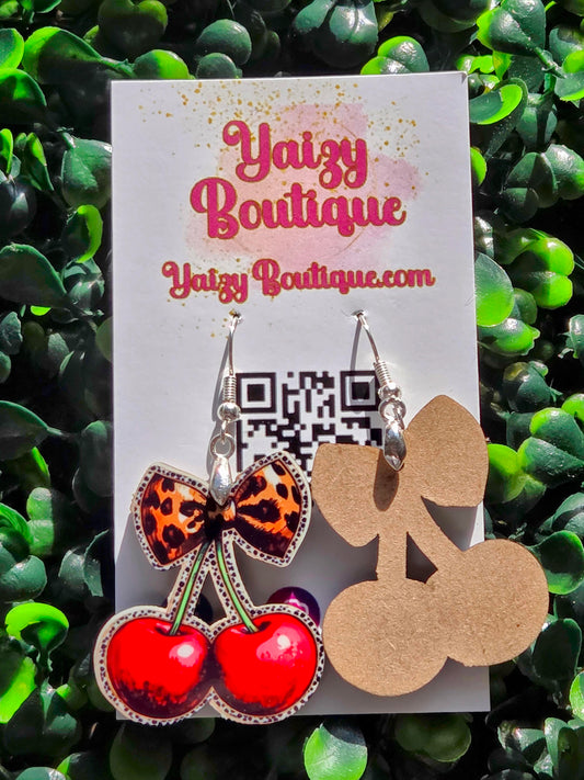 Retro Cherry Earrings with Leopard Bow – Handmade Statement Jewelry