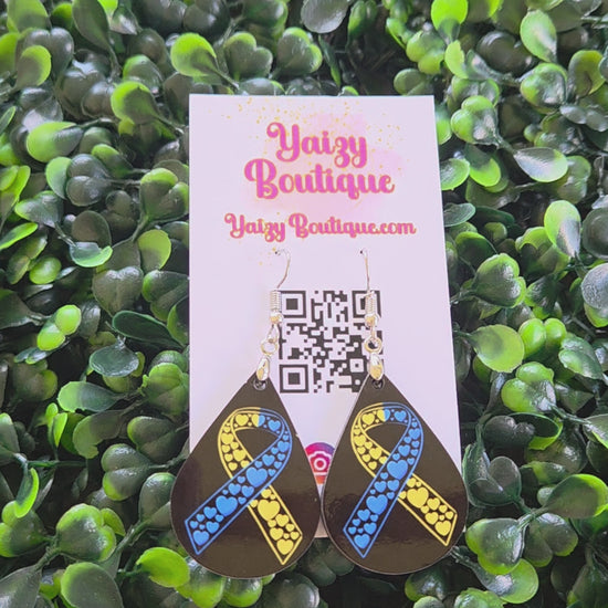 Show your support and spread awareness with these handmade Blue & Yellow Heart Ribbon earrings. Featuring a beautiful awareness ribbon filled with hearts, these lightweight teardrop earrings are perfect for raising support for causes like Down Syndrome, Ukraine solidarity, and other awareness campaigns. A meaningful and stylish accessory to wear or gift.