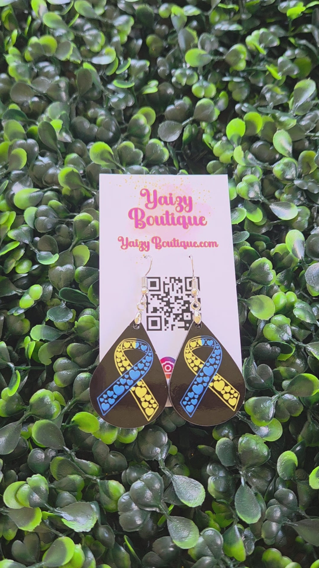 Blue & Yellow Heart Ribbon Awareness Earrings – Handmade Teardrop Design