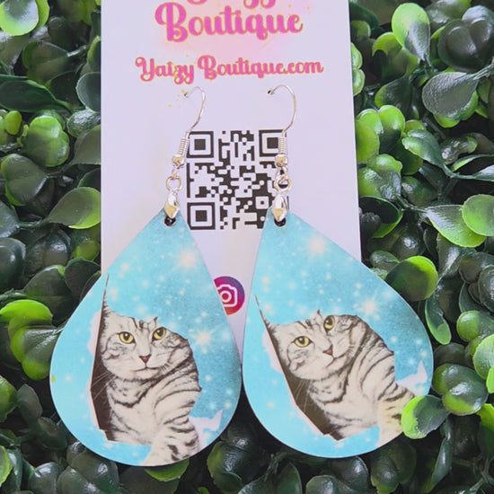 Add some feline flair to your style with these handmade cat earrings, featuring a striking silver tabby cat peeking through a cosmic starry blue background. Perfect for cat lovers, pet moms, or anyone who loves unique statement accessories with personality!