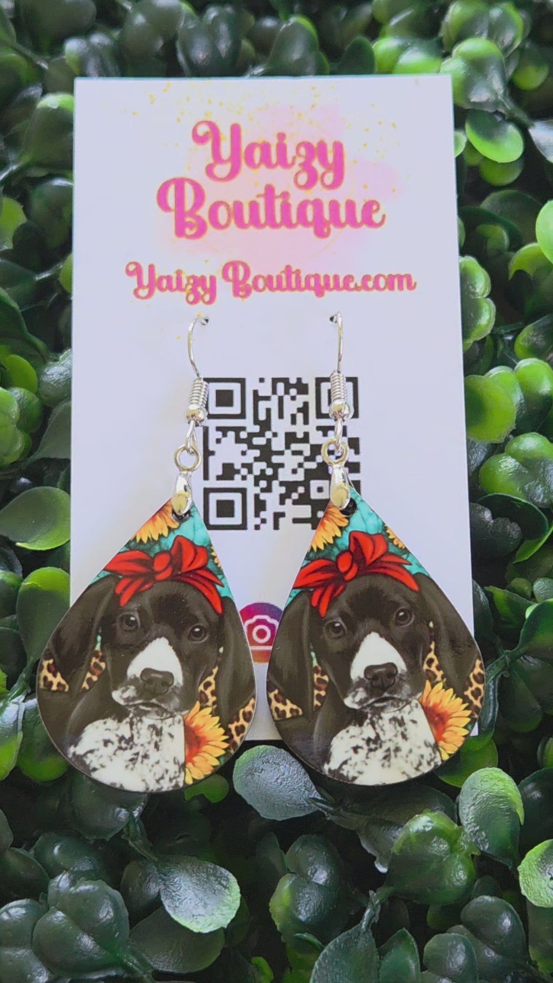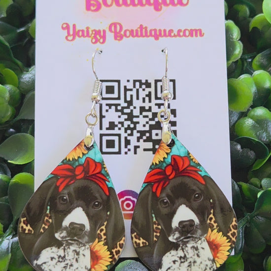 Show off your love for dogs with these charming handmade teardrop earrings featuring a black and white pup wearing a red bow, surrounded by sunflowers and leopard accents. Crafted on lightweight MDF wood with nickel-free stainless steel hooks, these earrings are fun, hypoallergenic, and perfect for dog lovers and boutique fashionistas.