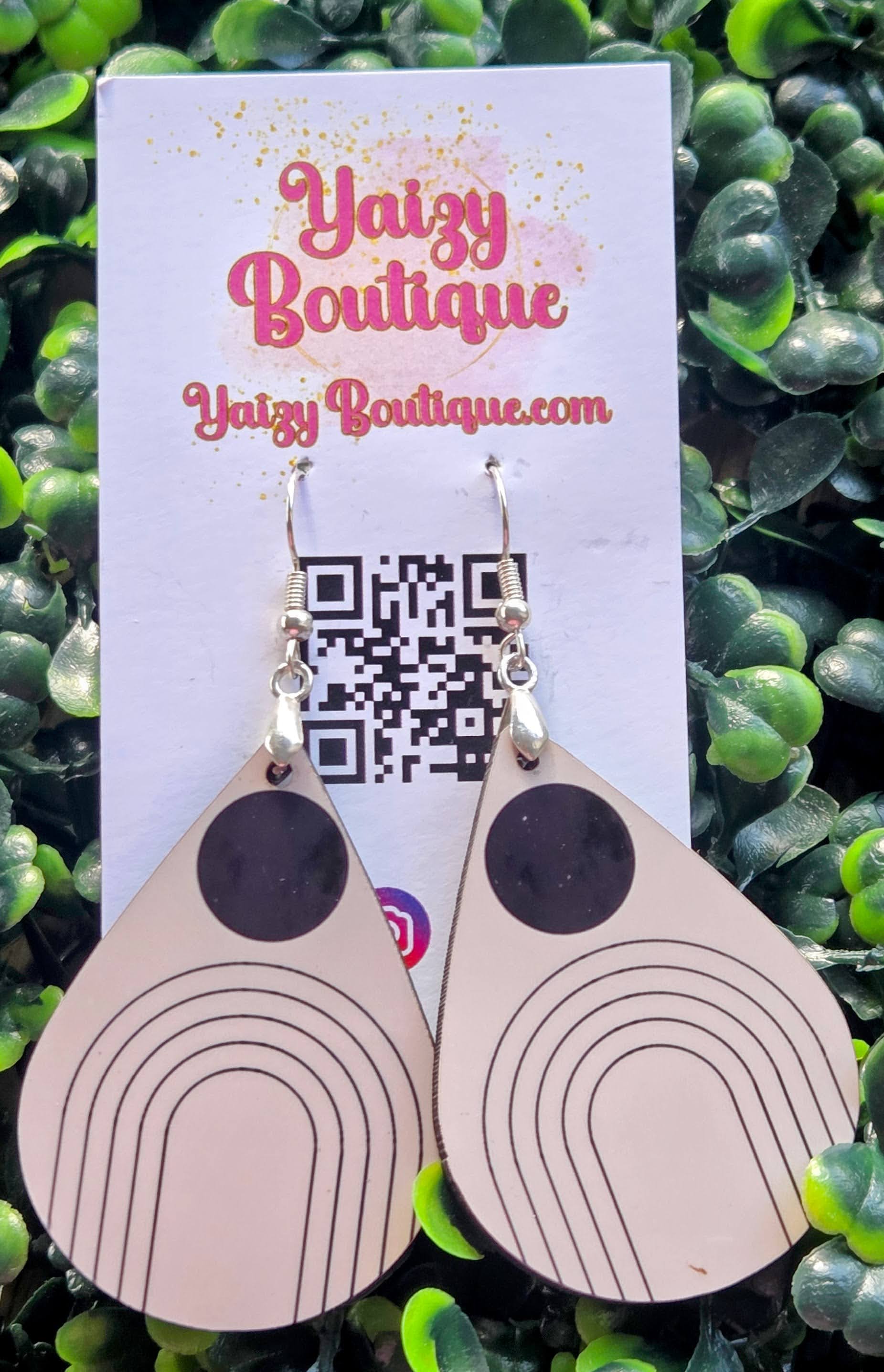 Neutral boho teardrop earrings featuring a modern black circle and minimalist rainbow line design, perfect for everyday outfits, teachers, and gift giving. Made from lightweight MDF wood with stainless steel hooks, these modern statement earrings pair beautifully with casual or dressy looks. Shop these handmade boutique earrings at YaizyBoutique.com.