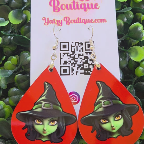 Get Halloween-ready with these bold and fun handmade Witch Emoji earrings! Featuring a green witch with glowing yellow eyes and a pointed hat on a bright red teardrop background, these earrings are perfect for spooky season lovers. Lightweight and eye-catching, they're a must-have accessory for Halloween parties and costume flair.