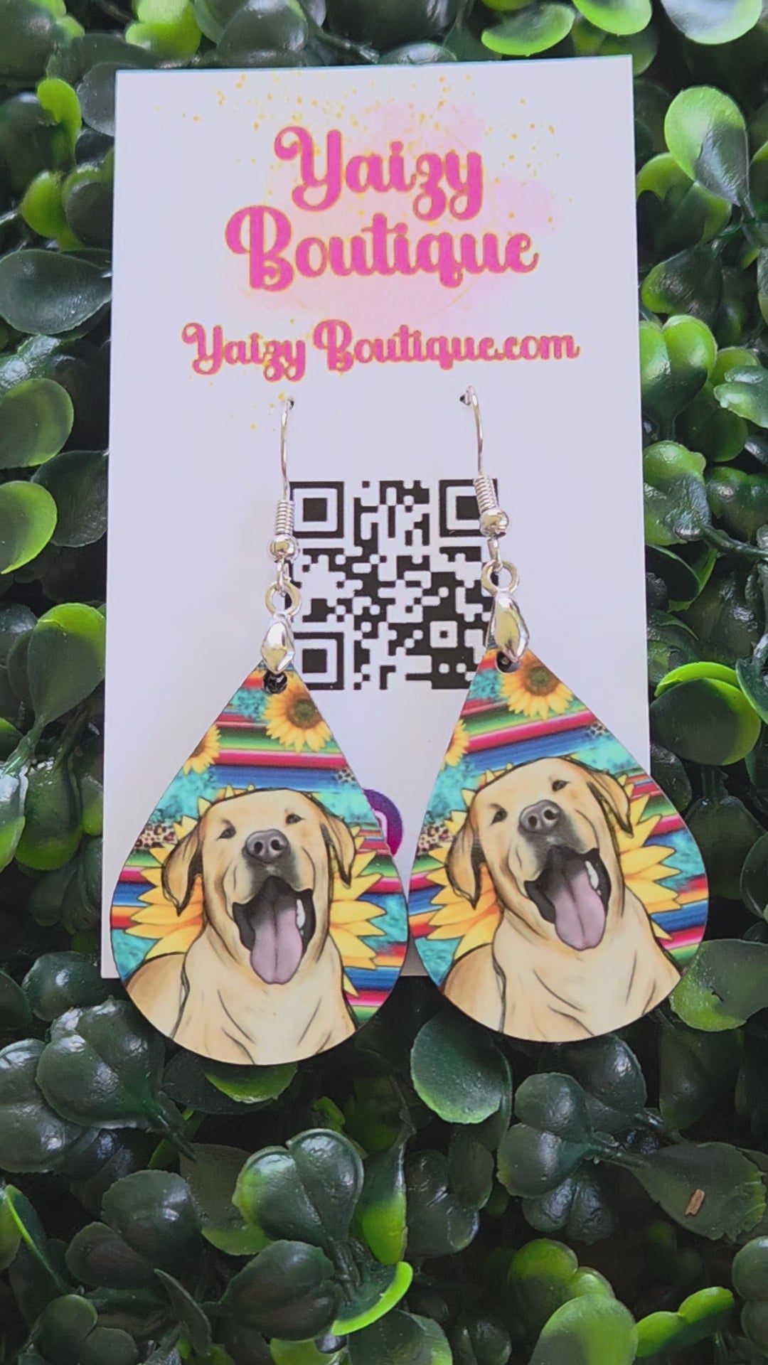 Celebrate your love for Yellow Labs with these handmade teardrop earrings! Featuring a smiling Labrador Retriever surrounded by bright sunflowers and a colorful Western-style background, these earrings are perfect for dog moms, pet lovers, or anyone who adores Labs. Lightweight, bold, and fun – the ultimate dog lover accessory.